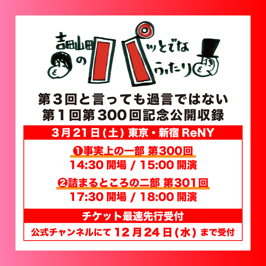3月21日(土)<吉田山田のパッとでなふたり 第3回と言っても過言ではない第1回第300回記念公開収録>開催決定!